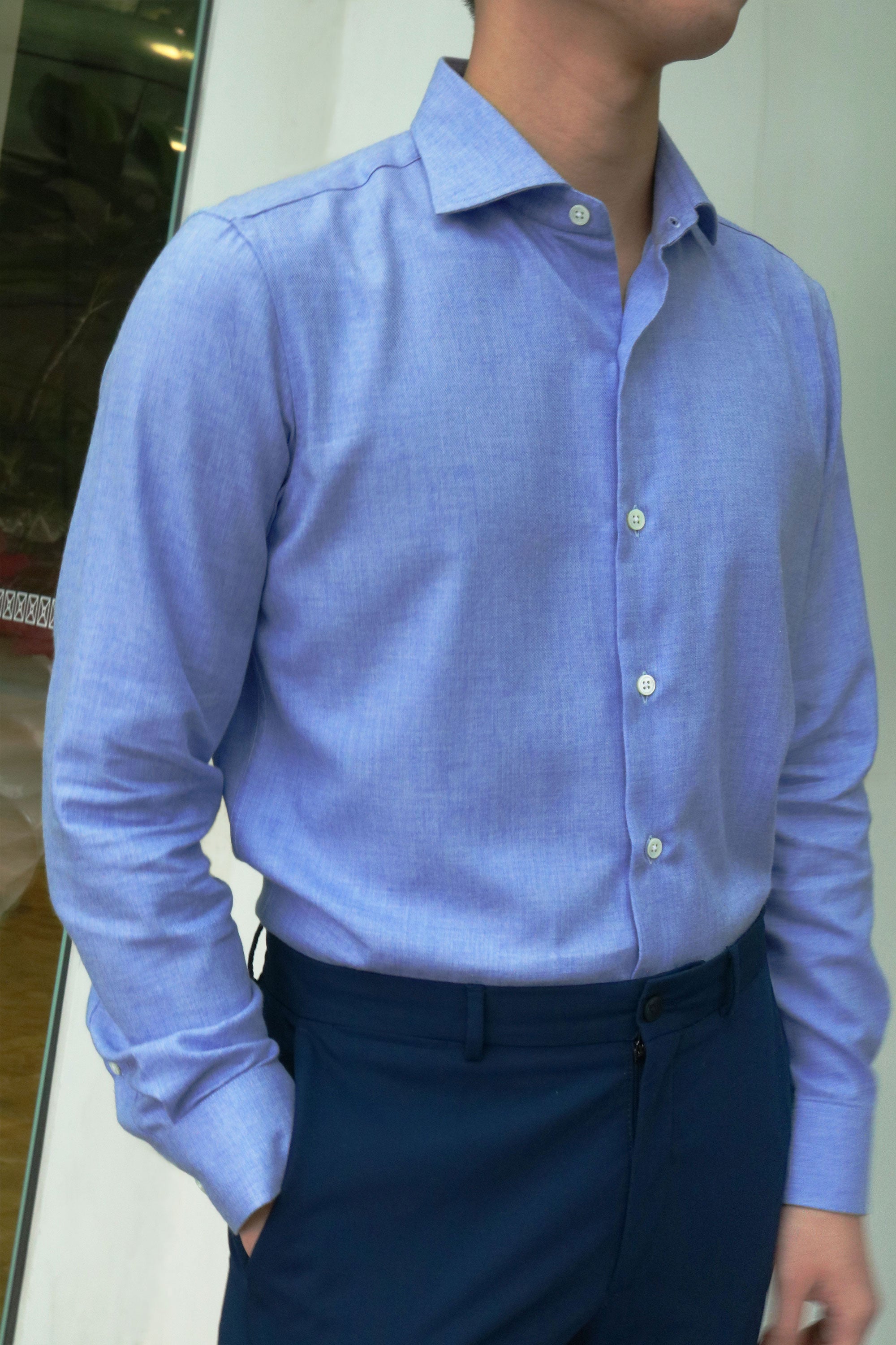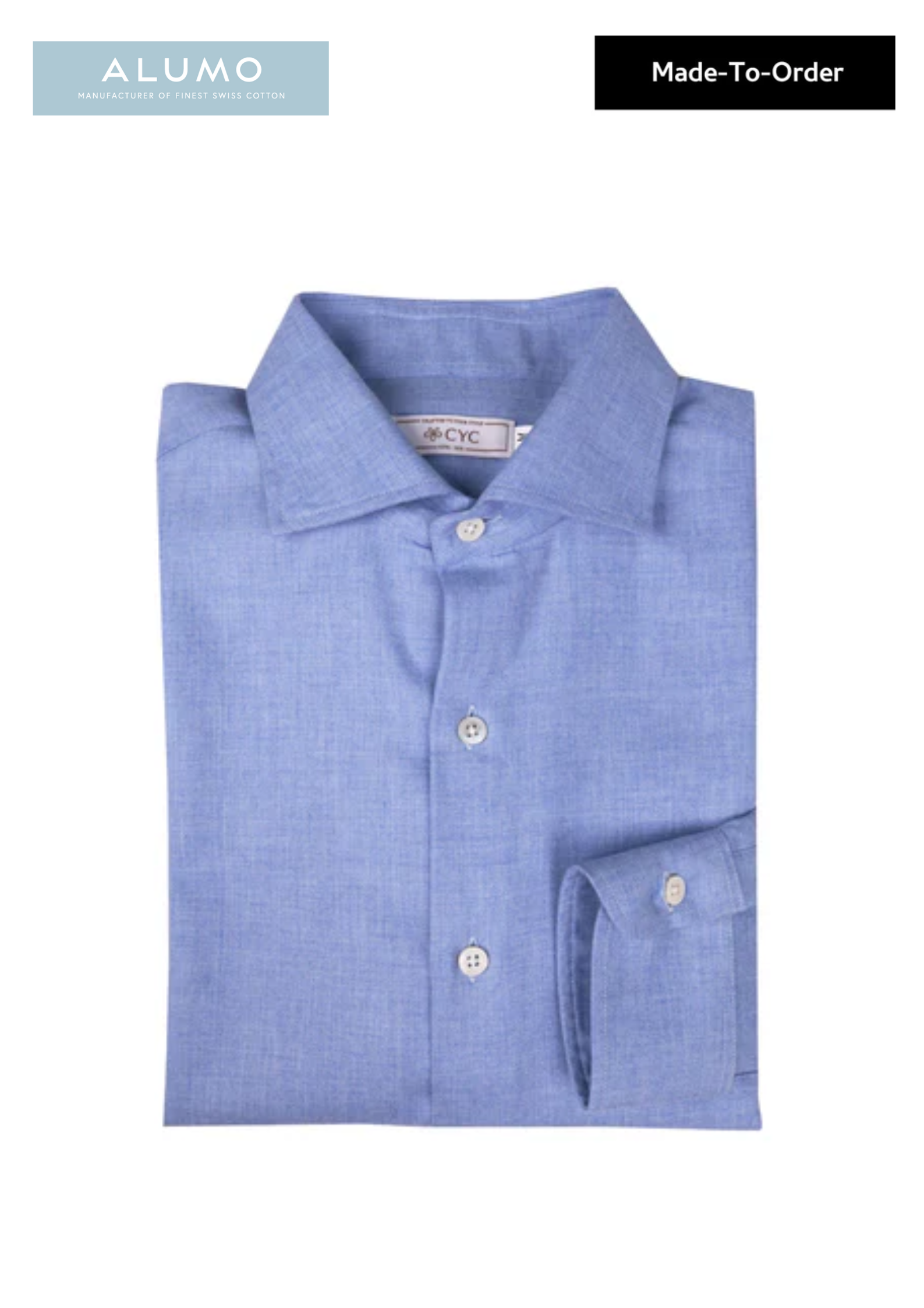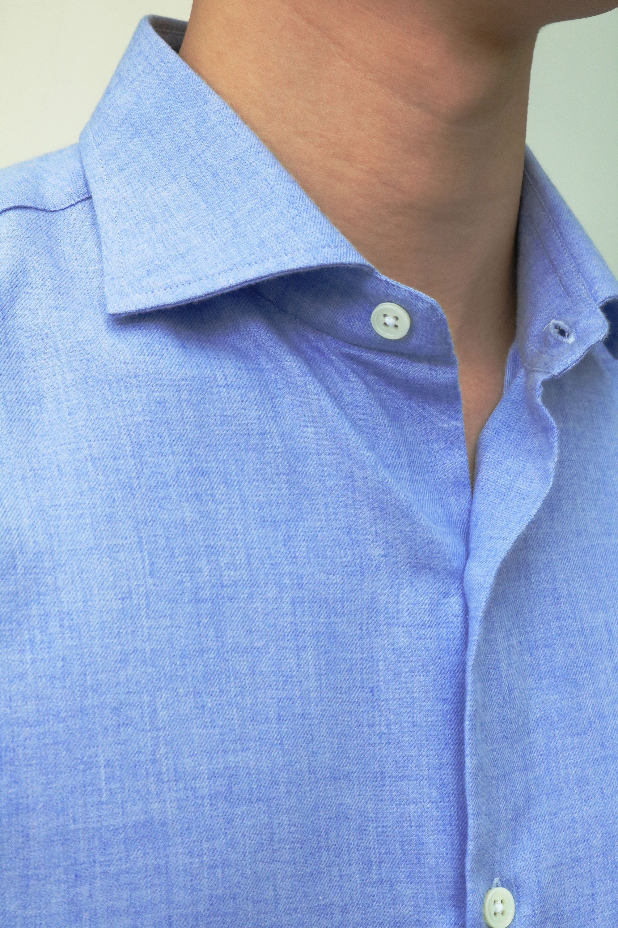 This ALUMO Cashmerello is in a league of its own – a blend of 15% carefully sourced cashmere and 85% fine Swiss cotton presents a soft, luxurious hand-feel only Cashmerello can offer. Twice as insulating as wool and crease-free, this brushed Cashmerello shirt is perfect for travelling or a cool indoor environment. We envision a soft luxury look paired with chinos, or with charcoal trousers for a more formal look.